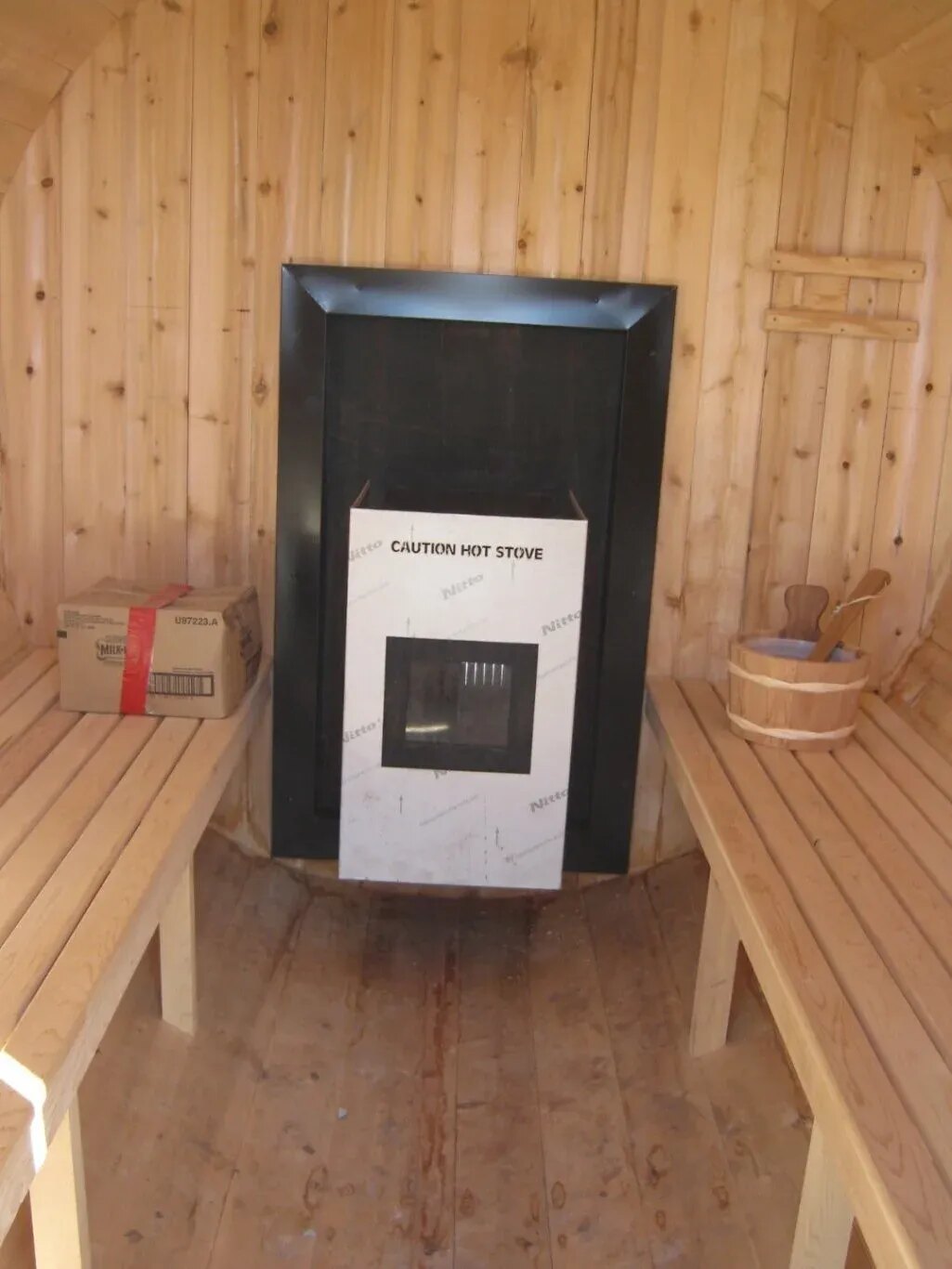 7' x 8' Barrel Sauna, shown with optional tarp/cover